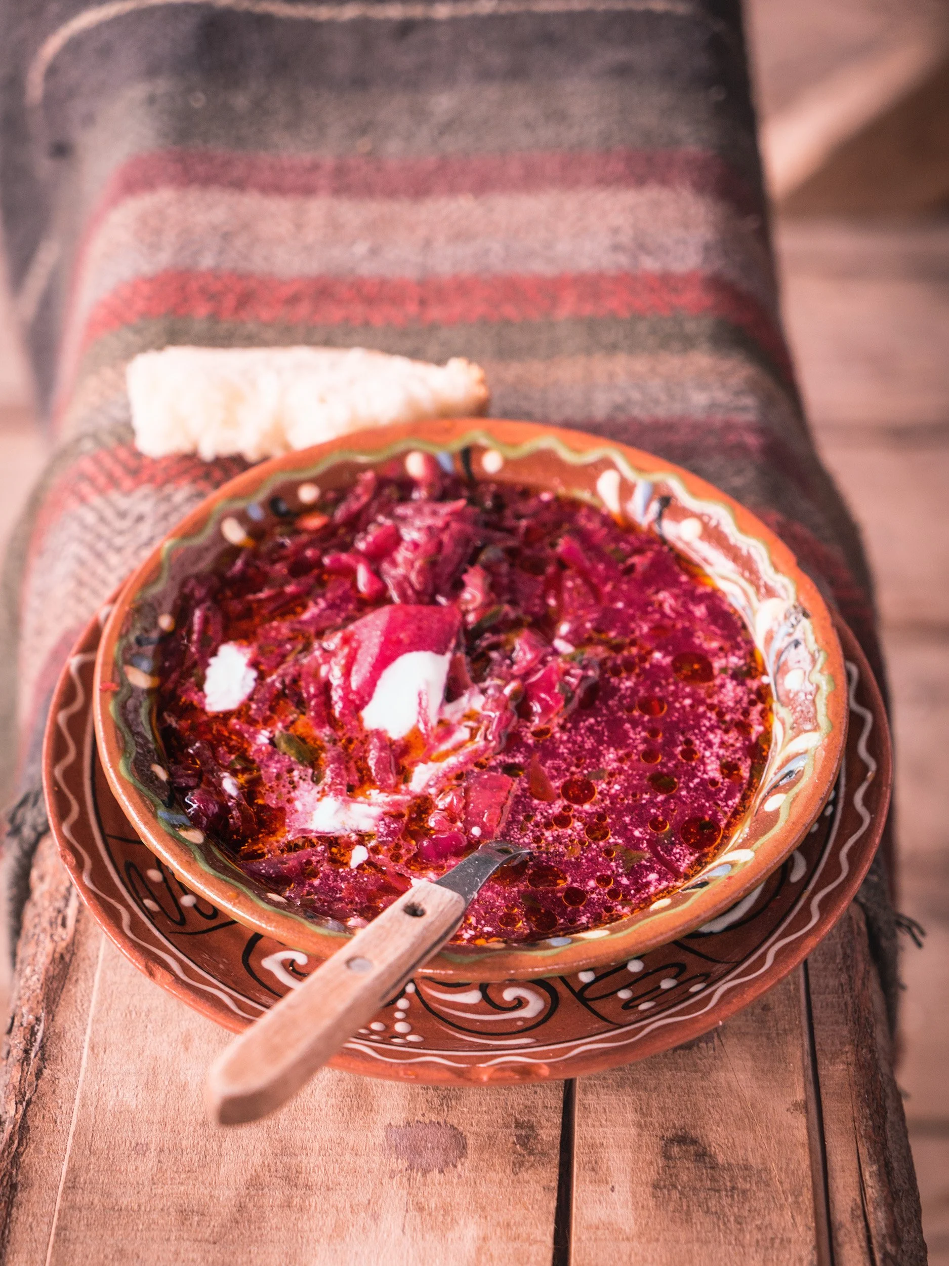 While working on a photoshoot for our beautiful Bread Project Worldwide, we were served a tasty borscht, a popular soup from Eastern and Central Europe (mainly Russia and Ukraine). The soup has a beautiful red color from beets, the main ingredient.